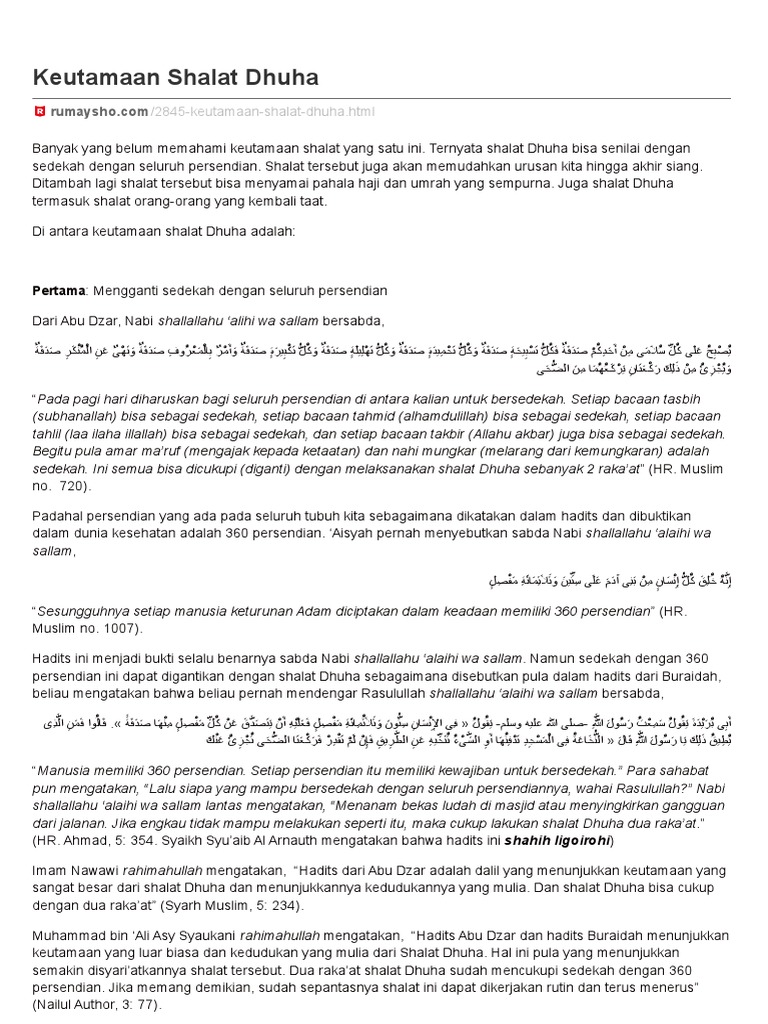 Mengerjakan shalat dhuha memiliki nilai yang sama seperti nilai amalan seperti keutamaan sedekahsesdekah yang dimaksud adalah sedekah yang diperlukan oleh 360 persendian tubuh kita terlebih jika kita ikhlas mengerjakannya baca ciri ciri orang yang tidak ikhlas dalam beribadah orang islam yang mengerjakan shalat dhuha akan memperoleh ganjaran pahala sebanyak. Salah satu buktinya ialah waktu pelaksanaanya sholat dhuha yang hanya bisa dikerjakan setelah terbitnya matahari dan berakhir sebelum masuknya waktu dhuhur. Tata cara sholat dhuha lengkap niat doa keutamaan shalat dhuha by admin posted on december 13 2018 march 9 2019 sholat dhuha adalah ibadah harian yang hukumnya sunnat di kerjakan.